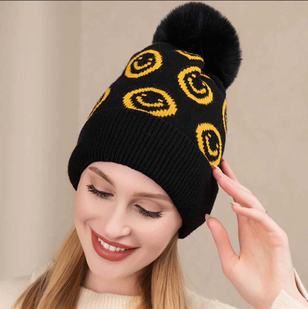 Smile Patterned Faux Fur Pom Pom Beanie